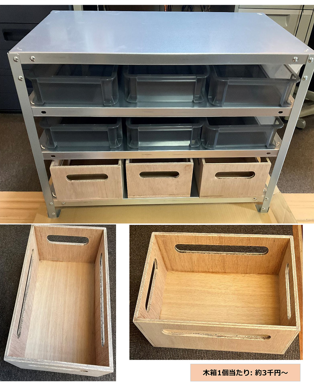 スチール棚とプラスチックケースは既製品ですが、工具類を保管するためのちょうどよいサイズのケースが見つからなかったため、